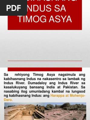 INDUS SA TIMOG ASYA Sa rehiyong Timog Asya nagsimula ang kabihasnang Indus na nakasentro sa lambak ng Indus River. 37 Full PDFs related to this paper. Umusbong ang kabihasnan ng timog Asya noong 1922 natuklasan ang mga labi ng sinaunang kabihasnan.