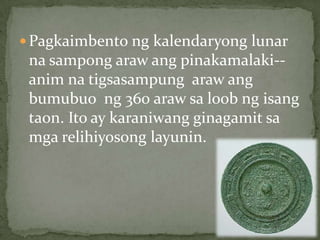 Subalit may panahon na ang ilog ay umaapaw. Arthasastra paper scroll kalendaryo Taj Mahal Ayurveda chariot. Ang tradisyunal na kalendaryong Tsino ay namamahala pa rin sa mga tradisyunal na gawain sa Tsina at sa mga komunidad sa Tsino sa ibang bansa tulad ng Bagong Taon ng Tsino.