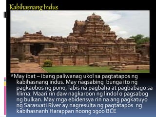 Ang Sinaunang Kabihasnan sa Lambak ng Ilog Indus Matapos ang mahabang panahon ang mga kabihasnan sa lambak ng Tigris at Euphrates ay bumagsak. Para malaman ang pamahalaan ng Kabihasnang. Ang Kabihasnang Indus Ang lambak ilog Indus at Ganges ay makikita sa Timog Asya.