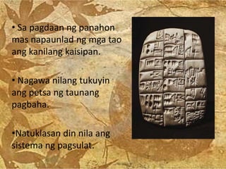 Sinasabing ito ay naganap noong 5000 - 1200 BCE. Cuneiform - sistema ng pagsulat ng mga Sumerian. MGA URI NG ANYONG LUPA a.
