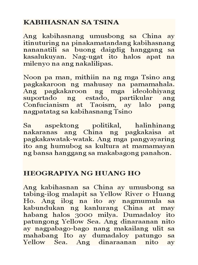 Ii b araling panlipunan relihiyon at kultura. Patunay rito ang pagkakatuklas ng mga arkeologo ng mga ebidensiyang may Sistema ng pagsasaka ang mga Tsino may 8000 taon na ang nakararaan. Hinubog ang 4000 taong kasaysayan ng pamumuno ng mga DINASTIYA o mga Linya ng mga Pamilyang namuno sa Tsina sa halos ilang libong taon.